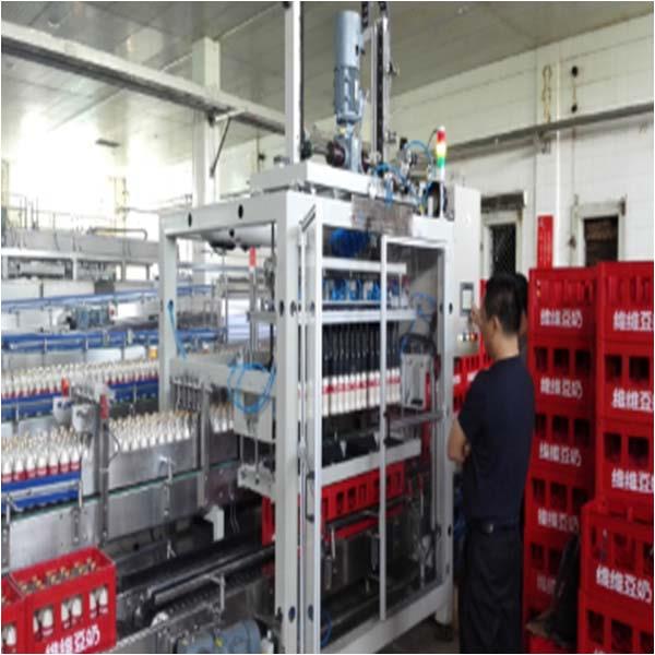 設備用于光明禮品的包裝線,將禮品包編組放置到大箱中。能夠同時支持兩臺禮品包包裝機。機械手完成裝盒動作之后,可以根據禮品包的進入通道,將大箱切換到相應的輸送線上。